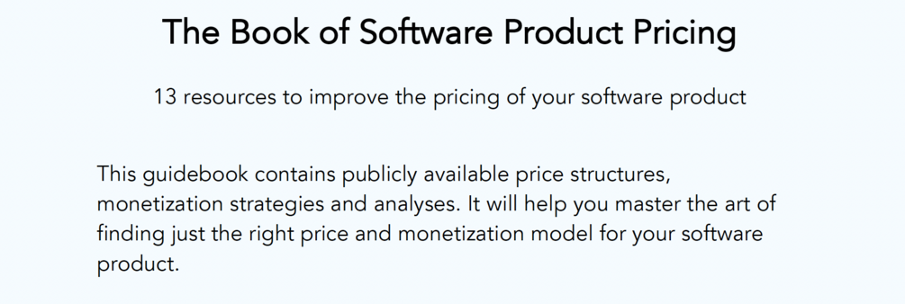 This guidebook contains links to 13 carefully curated, publicly available price structures, monetization strategies and analyses. It will help you master the art of finding just the right price and monetization model for your software product.